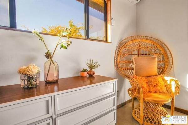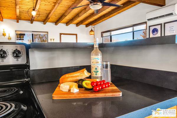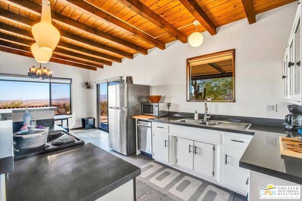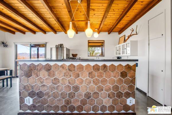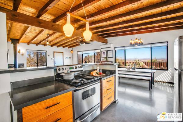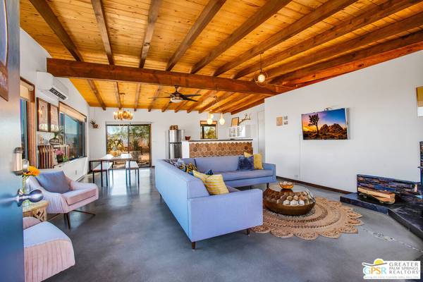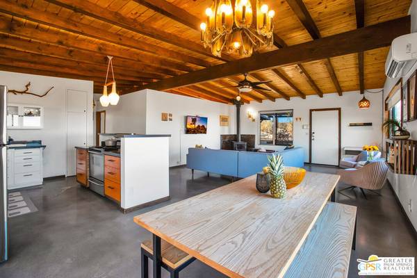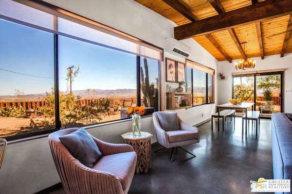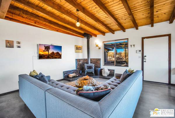 This desert retreat, nestled on a sprawling 2.5-acre mesa just moments from Joshua Tree Village and the iconic Joshua Tree National Park, offers a captivating blend of mid-century charm and breathtaking panoramic desert views. Imagine waking to spectacular sunrises painting the rugged mountains visible through expansive picture windows, or witnessing incredible cloud formations and the serene rise of the moonscape from the comfort of your living room. The home exudes character with its warm tongue and groove beamed ceilings, cozy wood-burning stove and smooth-coated stucco exterior. The seamless connection to the outdoors is undeniable, with multiple sitting areas inviting you to embrace the tranquility of the desert. Picture yourself unwinding in the spa under a canopy of stars, gathered around the fire pit on cool desert nights, while enjoying the lush, drought-tolerant landscape. This curated collection of cacti, desert willows, palo verdes, mesquites, and even fruiting olive trees has been admired on past landscape tours, a testament to the property's unique allure. Beyond the captivating aesthetics, this property offers practical appeal. An oversized detached garage and an expansive carport provide ample space for vehicles, storage. More than just a home, this secluded sanctuary offers a true escape for those seeking peace and connection with nature. With its generous acreage and inspiring natural beauty.
