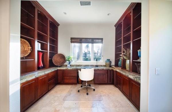 Casa Hiraya is a refined desert retreat on the 14th fairway of The Palms Golf Club, offering sweeping views of the Santa Rosa Mountains and lush greens. This 3-bedroom home features cool stone floors, rich teak doors, and an open floor plan centered around a chef’s kitchen with granite counters and generous cabinetry—perfect for entertaining or quiet evenings at home. A detached casita with a built-in office nook provides flexible space for guests or remote work. Multiple fireplaces—one indoors and two outside—create cozy gathering spots throughout the property. The expansive backyard patio includes a built-in grill, outdoor dining area, and tranquil citrus arbor with a bubbling fountain, ideal for morning coffee or sunset cocktails. Enjoy seamless indoor-outdoor living in a peaceful, private setting. Located near hiking trails, tennis, pickleball, theaters, dining, and a dog park. Refundable security deposit required. Full details provided upon booking.