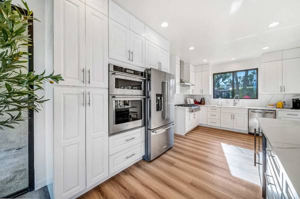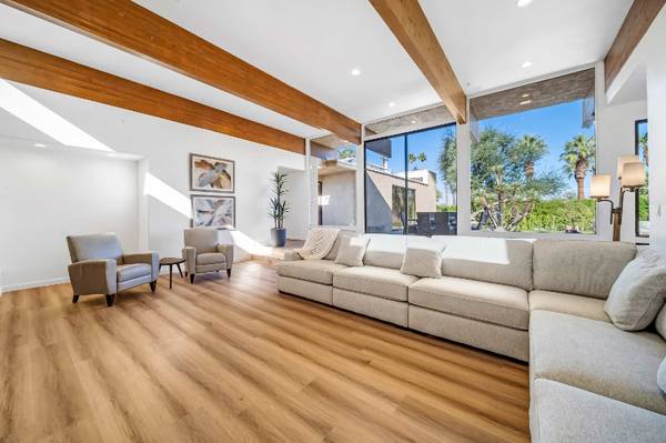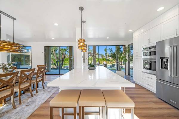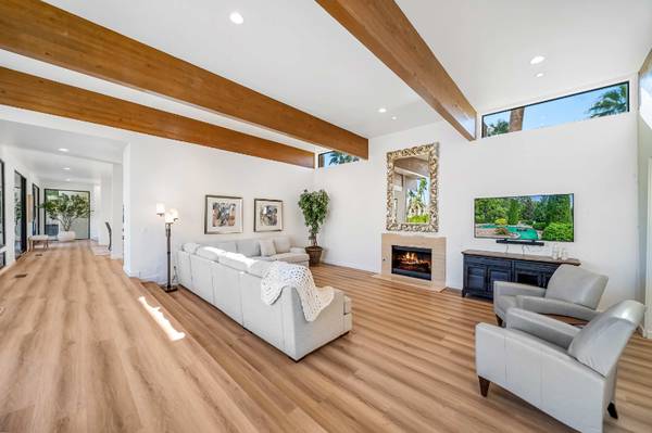 Casa Ironwood is a 3,224 sq ft Mid-Century Modern gem on a 0.5-acre lot in Palm Springs. This 3BR, 3BA home features hardwood floors, open living areas, and abundant natural light. The living room offers desert views, plush seating, and a cozy fireplace. A chef’s kitchen includes high-end appliances, granite counters, and an island with seating, flowing into a formal dining area with a rustic table. All bedrooms feature king beds and stylish decor; the primary suite has pool access and a spa-like bath. Outside, enjoy a private oasis with a pool, spa, lounge seating, and a striking bronze horse sculpture. A refundable security deposit is required.