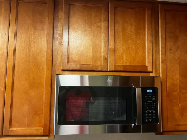 Brand new stainless steel GE appliances including side by side double doors refrigerator.