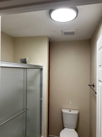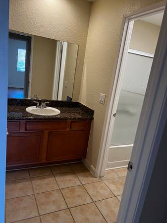 Laminated wood floor in the bedroom, tilled flooring everywhere else.