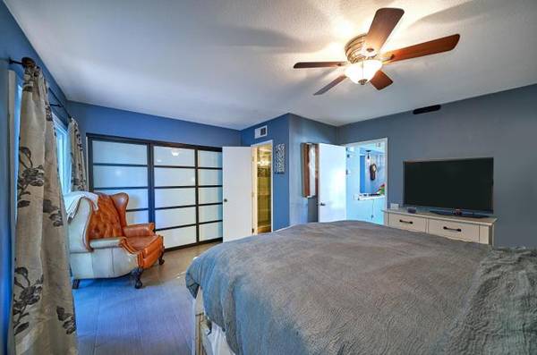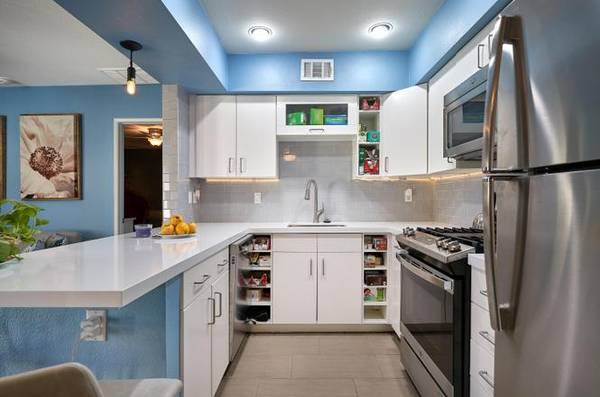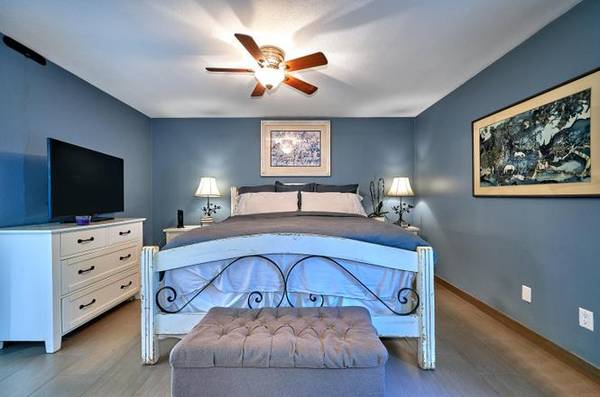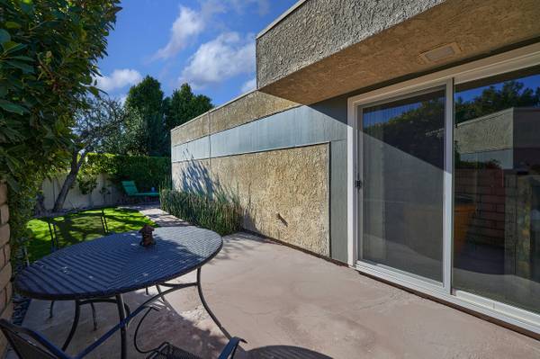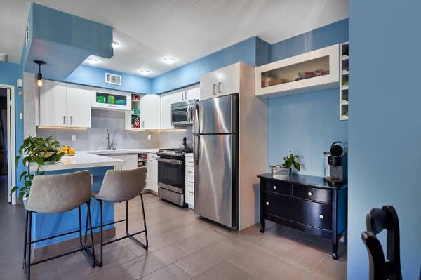 Gated Sunrise Palms beautiful 1 bedroom 1 bath, 2 car garage, private fenced professionally designed backyard condo, lives like an elegant home. Perfectly located with in the community. This condo has been completely remodeled top to bottom. Every exterior and interior door and slider replaced including a Pella 3 panel glass front door and glass storm door. Replaced privacy glass adjacent accent window. Slider in bedroom has dog door inset and can be removed. New remote controlled garage door. Door that leads from condo to garage direct. New custom bedroom sliding closet doors. Kitchen remodeled with open look and expanded dining area, extended pure white quartz countertops with counter seating space. New semi gloss white metal cabinets and gray subway tile backsplash. New LG top load washer and dryer. GE stainless steel appliances featuring a slide in 4 burner gas stove with grill. Lighting in kitchen and dining room on dimmers. Wood look tile floors with a 4 inch tile wall base through out. The remodeled bathroom has a sparkling tile walk-in shower with a frameless glass shower door and wall. Rheem water heater recently installed in. Amana high efficiency HVAC system in stalled.