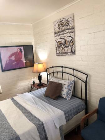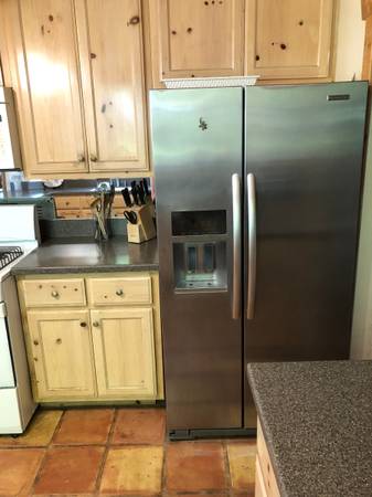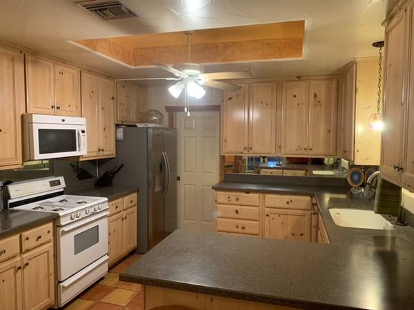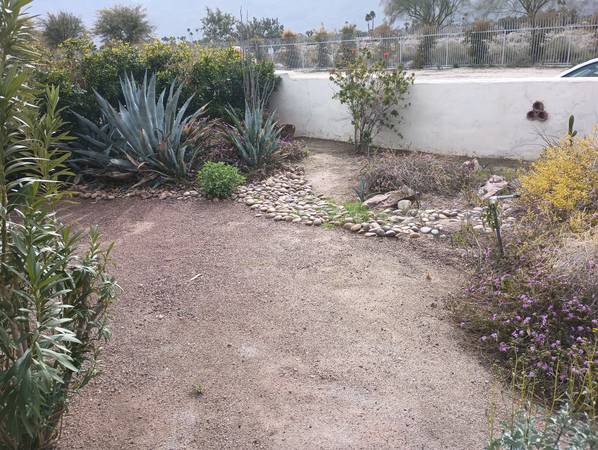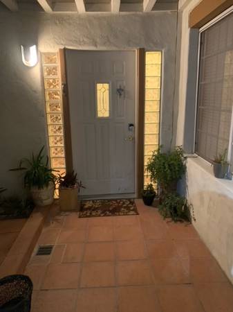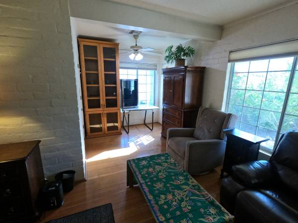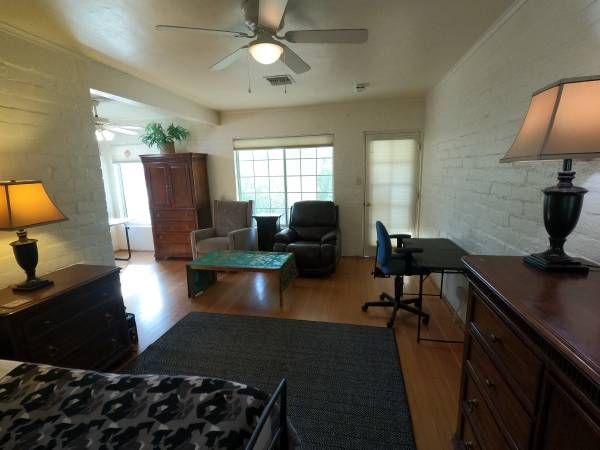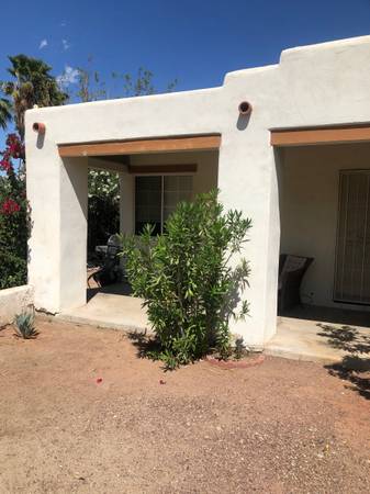 Unobstructed mountain views from the front porch and colorful walled garden. This vintage house was constructed in 1938 and has the original wood floors and brick walls in bedroom area, saltillo tile floor and fireplace in living space. Can be rented either furnished or unfurnished. Large kitchen with gas stove, adjacent to a laundry room with washer and dryer. New HVAC system. The huge master suite includes a spacious bathroom with a large tiled shower and mirrored closet.The windows provide ample natural sunlight, but are covered with shades when you want it darker. The vacant land across the street is a preserve permanently protected from development. The owner lives next door. Easy walking distance to shopping, dining, banks, and bus routes. Rent includes electricity, water, and garbage.