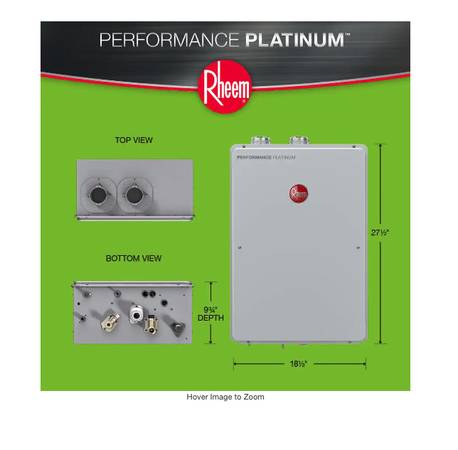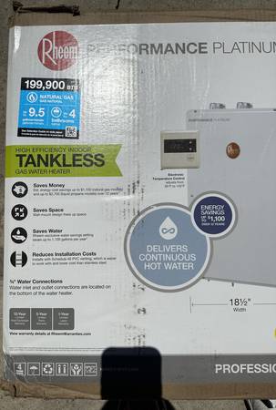 Rheem Performance Platinum 9.5 GPM Natural Gas High-Efficiency Indoor Tankless Water Heater Brand new. 1 available. Model # ECOH200DVLN-2 See detailed pictures. All parts included. Retails for $1469...