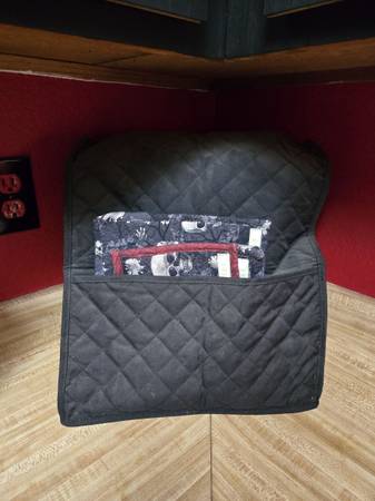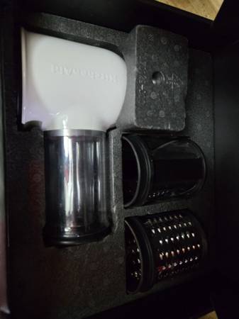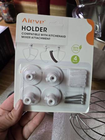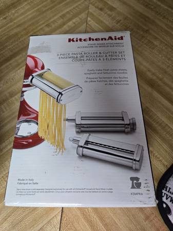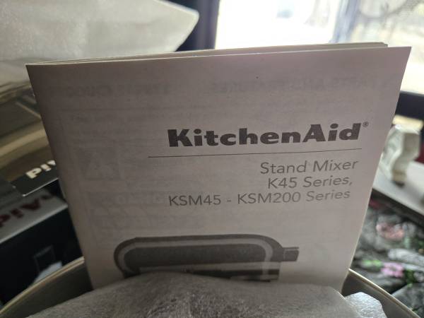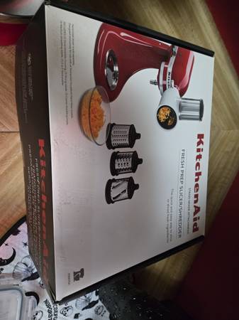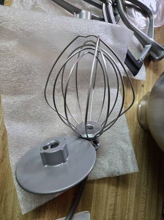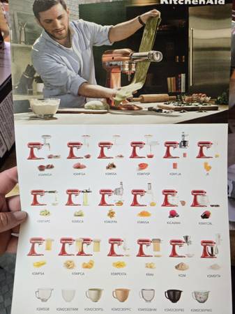 All attachments, cabinet hangers for attachments, black quilted cover *all but the pot holders seen in pic* 4.5 quart bowl and 5 quart bowl with guard. Purchased in 2023. Used mixer maybe 4 times. Grater used maybe twice. Going through a divorce and he threw away the mixer, which is how the crack happened. I've had it covered sitting in the corner of my kitchen since. Just can't bring myself to use it without bringing up the trauma. All you see in photos would cost $870 and then some. $650 for all. Works like brand new, only issue is that crack/chip in paint 😔