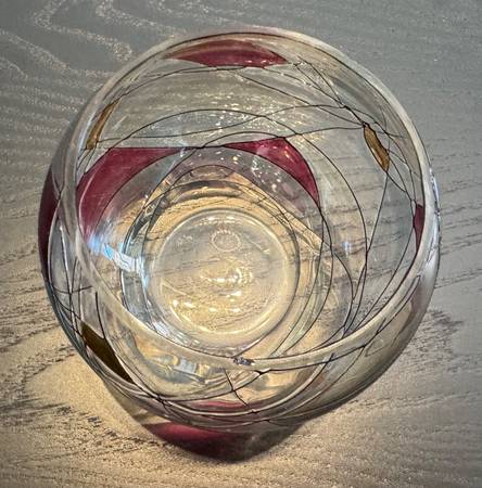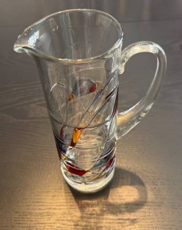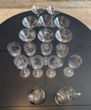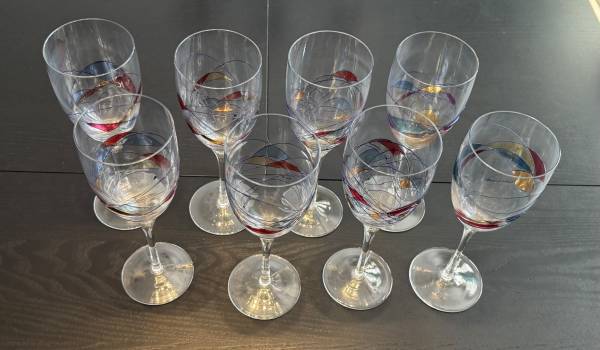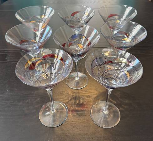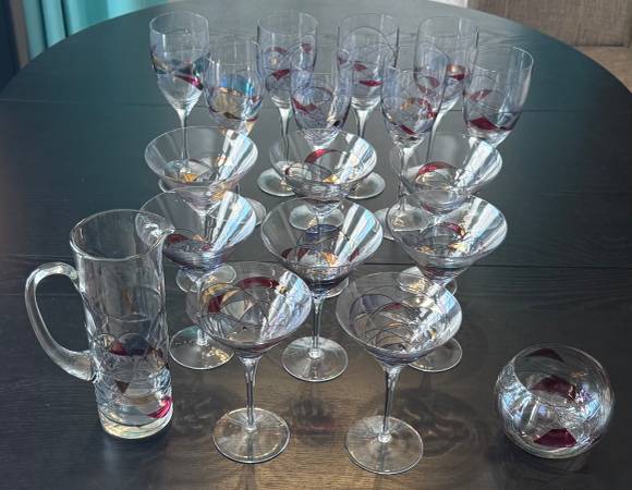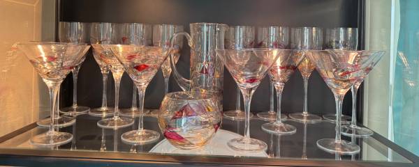 18-piece set of Hand-Blown Romanian Milano Stained Glass Mosaic Style with Swirl Design. This set includes 8 Martini glasses, 8 Water/Wine Glasses, an Art Glass Romania Bulbous Vase, and a Milano 6 Cup Martini Pitcher. The Martini glasses are 7 1/2" tall, the Wine/Water goblets are 9 1/2" tall, the Pitcher is 9 1/2" tall, and the Vase is 4" tall. Set is in excellent condition.