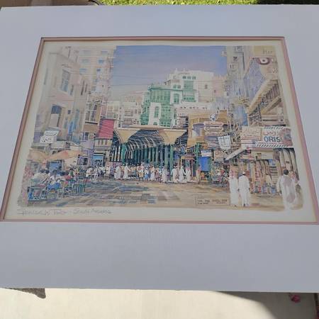 These are two water colours by Spencer Tart, one measuring 13 x 17 inches Gabel Sub Jeddah and the other Baiya Square Jeddah.is 14 X 19 inches. They were framed several years ago. The full size of the frames is 24 and 1/2 by 29 and 1/2 inches. Gated community, so if you are using a GPS it will direct you to the back gate, in which case call before you arrive and I will meet you at the gate. Cash only.