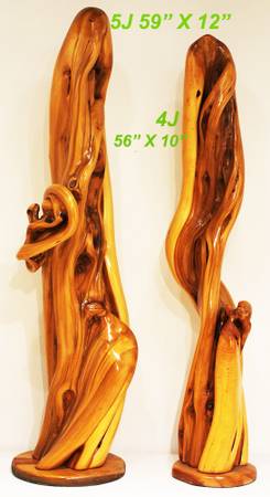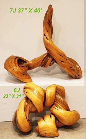 Nature’s Great Sculptures, Not Drift Wood, but dense polished wood. Windswept Juniper Wood Sculptures. Incredible pieces of natural art. Many, many pieces were polished but none held the lines and shapes that these piece does. Those that did not meet the level were casted aside. They weigh about 40 pounds. It is found only in the Northwest part of the U.S.A. These are truly one of a kind natural art pieces. Price $2500 to $3500 MORE THAN HALF THEIR VALUE or OBO