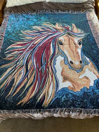 Original colorful horse painting by local artist transferred to tapestry blanket, measuring 4X5 feet. Makes a great gift for horse lovers and guests coming to Stagecoach Festival. Four available.