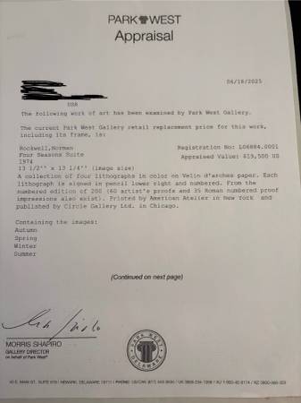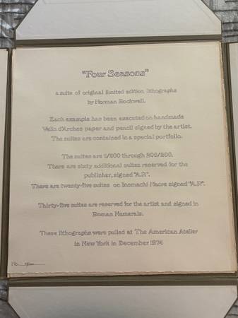 A collection of four lithographs in color on Velin d’arches paper. Each lithograph is signed in pencil lower right and numbered. Number 93 from the numbered edition of 200 (60 artist’s proofs and 35 Roman numbered proof impressions also exist). Printed by American Atelier in New York and published by Circle Gallery Ltd. in Chicago. Image size is 13 1/2” x 13 1/4”.
