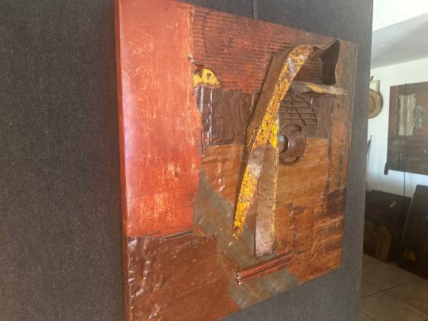 Award-winning Mixed media artist Anthony Messineo,, All my pieces are old recovered metal from old abandoned Homestead’s old abandoned desert roads, The sheet metal is hemmed around a wooden frame &then sealed , suitable for outdoors. I’m selling these pieces far below gallery prices many to choose from ,, you won’t be disappointed contact Anthony.
