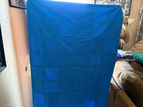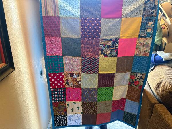 Handmade quilt. Lightweight 40 x 58 $75.00 or best offer. Beautiful bright colors backside is turquoise with moons, rainbows and stars.