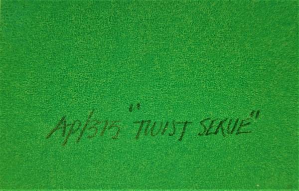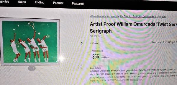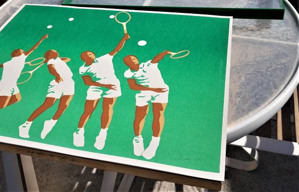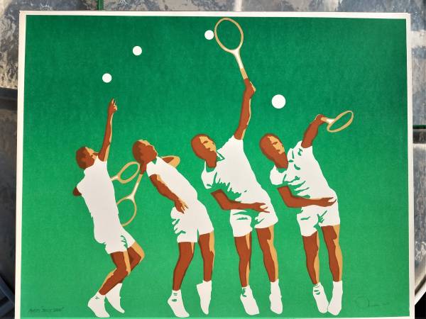 A William Omurcada artist proof serigraph titled, Twist Serve. This colorful silk-screen print depicts a man dressed in a tennis outfit executing a twist serve. It is framed in a custom made lucite and wood frame. This print was signed in graphite by the artist to the lower right and marked ‘AP/375’ in graphite to the lower left.