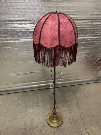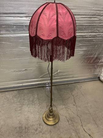 VICTORIAN STYLE FLOOR LAMP WITH BEAUTIFUL BURGUNDY SHADE WITH FRINGE BRASS APROX 5 FOOT TALL