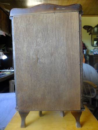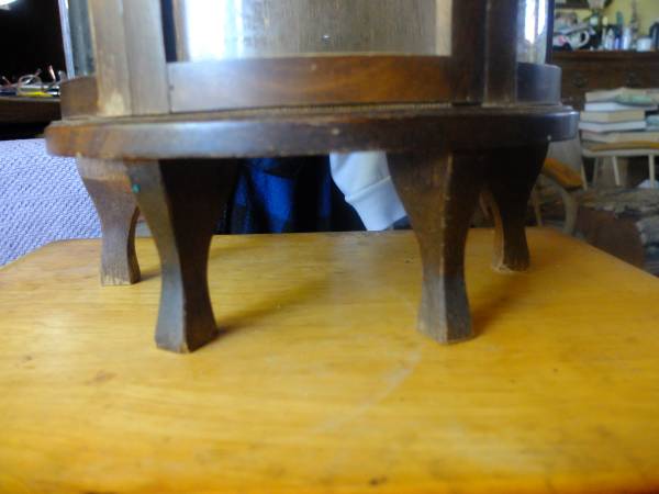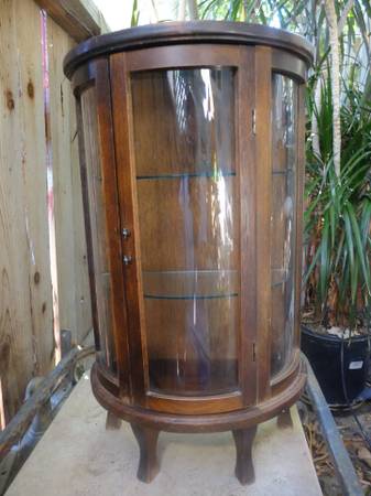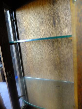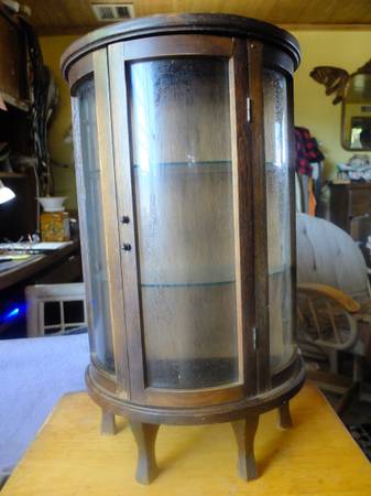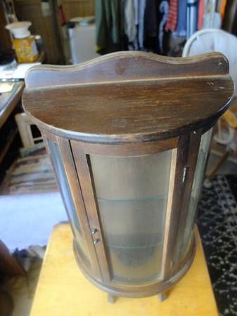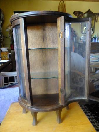 Small china cabinet (curio cabinet), 22 inches tall. Two glass shelves. Four footed. Latch is missing but opens fine. Needs a good cleaning. 1900's.