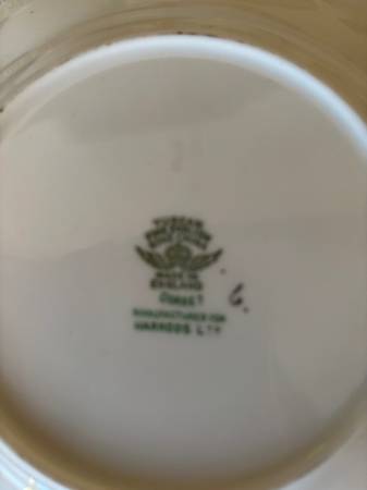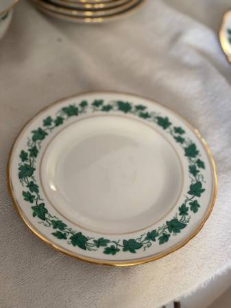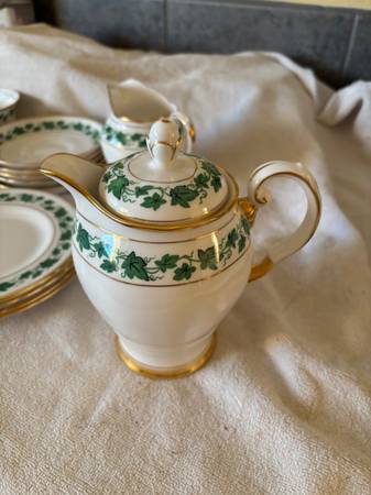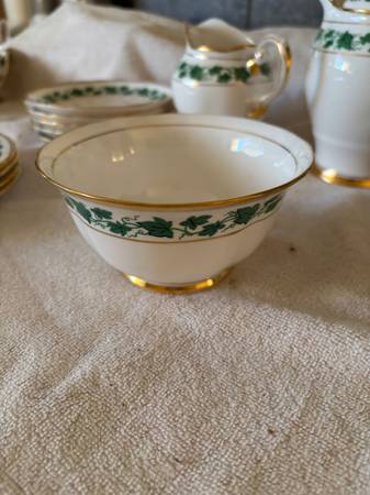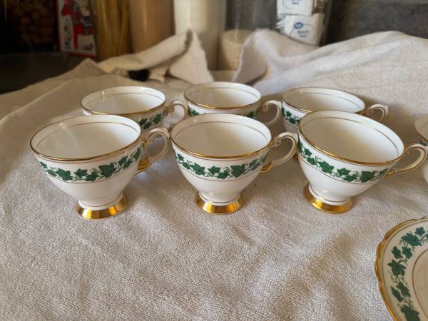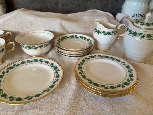 Tuscan Group China circa 1940's Fine Bone China 300ml Tea Size Milk or Cream Jug, Tea Cups, Plates & Bowl in the Ivy Leaf Dorset c9876 Pattern Commissioned for Harrods showing the 1940's Backstamp.
