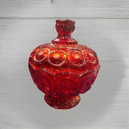 Vintage LE Smith Moon And Stars Amberina Or Flame Candy Dish Covered Candy Dish Has tiny hidden nicks from use Glows under UV light