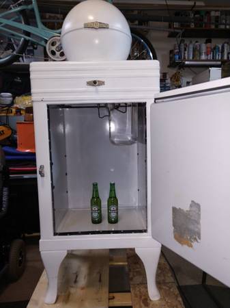 This is an original vintage GE CG-1-A16 Refrigerator from the 1930's. This machine doesn't need a lot of cosmetic work, but is a very complete example of this machine. That includes things like the original globe top that originally used sulphur dioxide for refrigeration has ice maker. This machine measures 61 inches tall by 24 inches wide be 22 inches deep. This item is perfect for your man cave or game room, and it works great.
