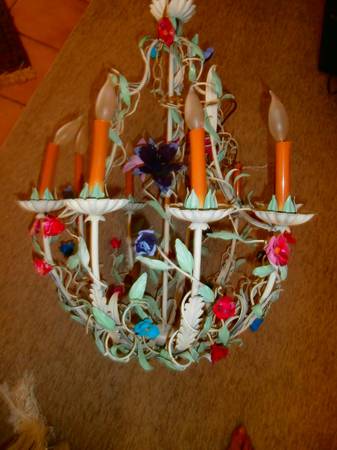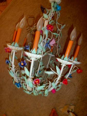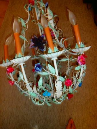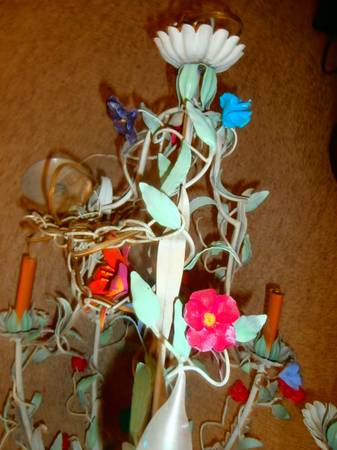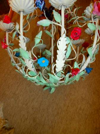 Italian tole chandelier with multicolored metal flowers and green leaves
