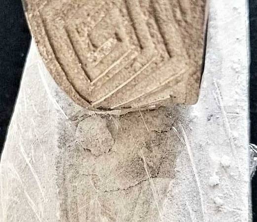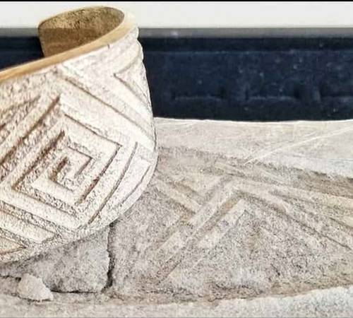The design around the Maze is hand incised. He prepare and compress the ashes, pour the liquid silver that I brought to his Shop/studio and latter, did the cleaning and texture right in front of me back in 2005.