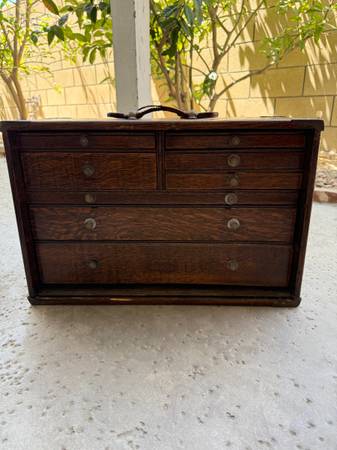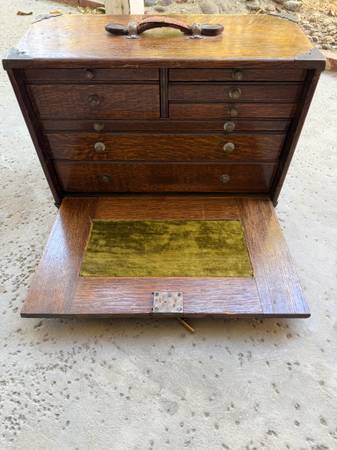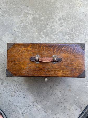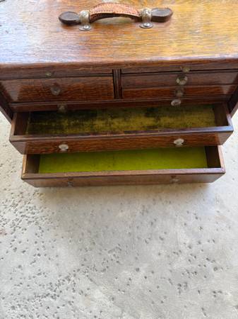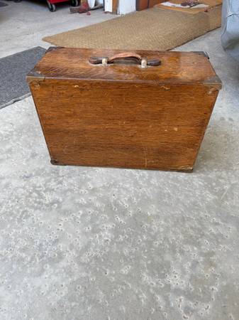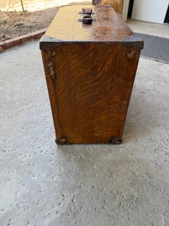 Very good condition vintage wood tool box with key. Top does not lift up like most tool boxes.