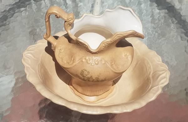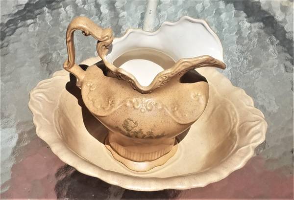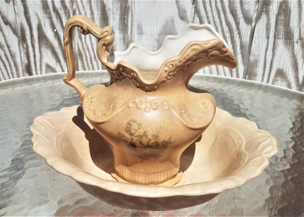 VINTAGE WASH BASIN and Pitcher set--great condition. Approximate Measurements: Bowl.... 16"long x 13" wide x 4" high . Pitcher....10.5"tall Please call Marc