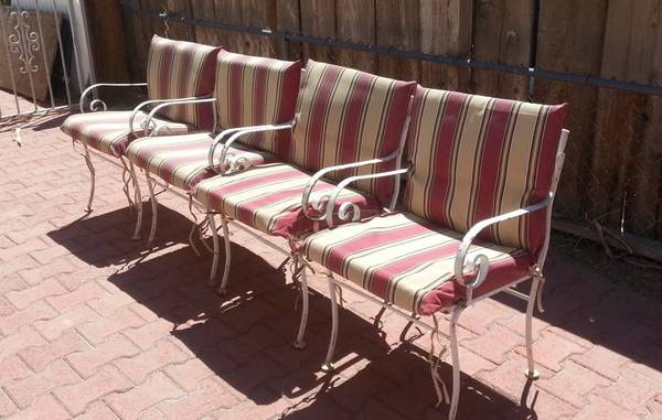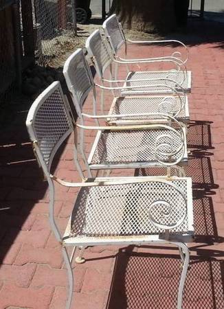 Very nice heavy duty matching set of 4 patio chairs. Made of wrought iron. With a unique pivot back that adjusts your back position. I have a wrought iron wire mesh table available. Please call Marc