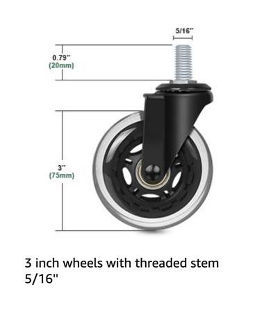 For sale: Twenty-two (22) stem casters with 3” wheels and 5/16” threaded stem.