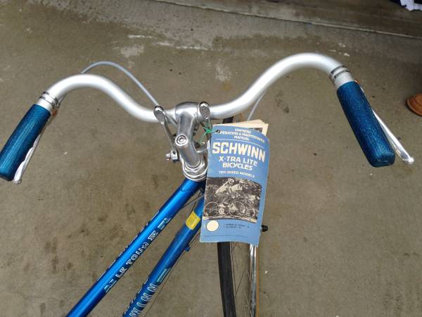 Very clean and nice '79 Schwinn 10 speed Le Tour IV bicycle. Great shape for age. Pearl Blue. May need tubes in tires. Includes original Owners Manual