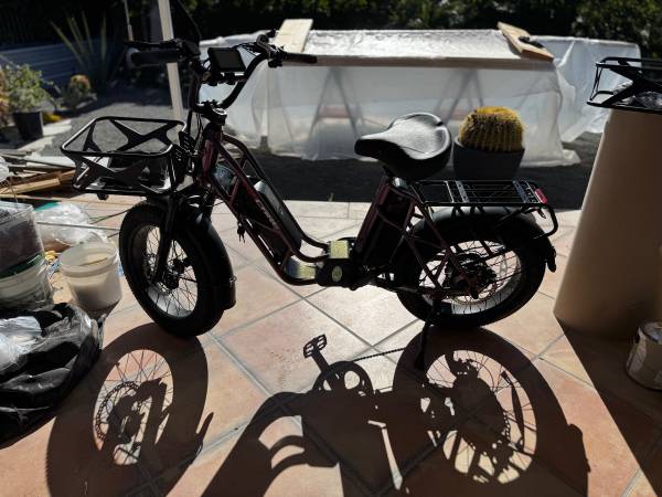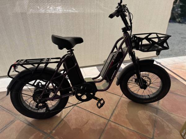 Gemini step thru cargo . 750W, dual batteries powerful 32mph. Purchased this year rode 2 blocks- too powerful excellent condition. Throttle, pedal assist. City commuter or or off road. Purple metallic. Comes with, 2 chargers, front and rear baskets, left mirror, bike lock, phone holder, tool kit. Sells $1700, will sell $850