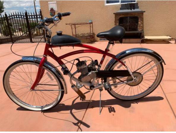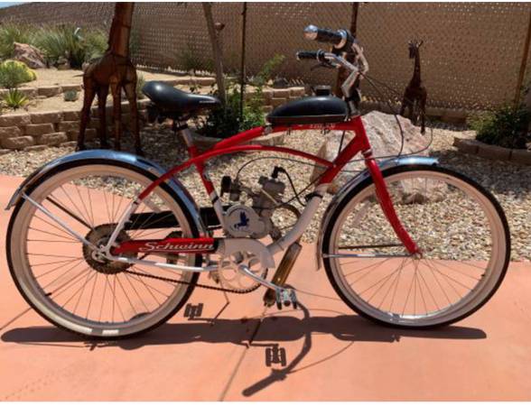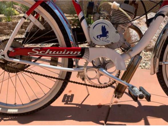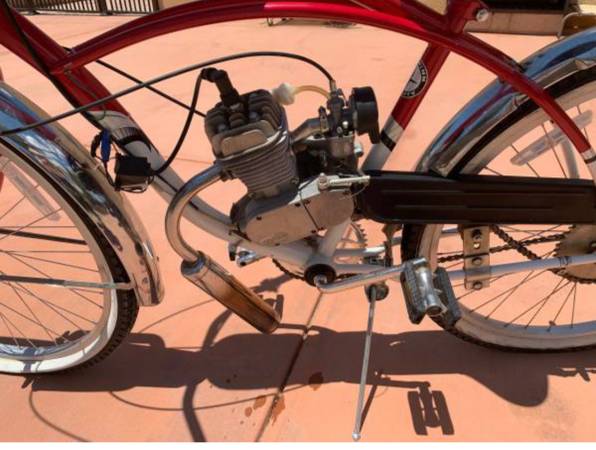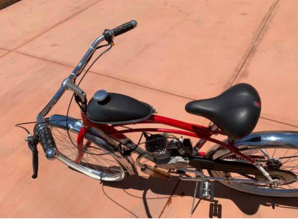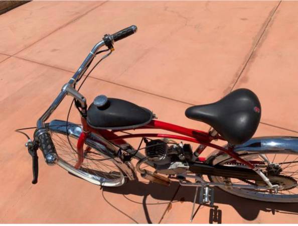 Schwinn beach cruiser w/50 CC Custom Motorize Motor. It is being Kept in storage. Never use. Will need possible new tubing on tires. The bike is 2 Stroke. The lower position to the ground is 30”...