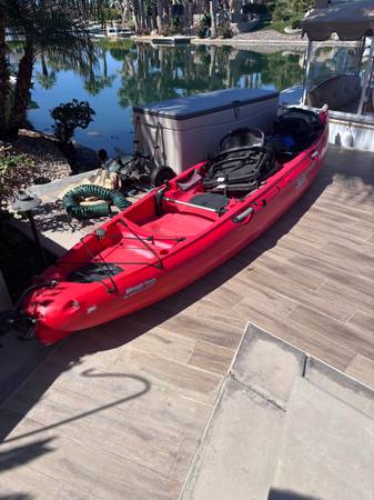 GREAT TANDEM KAYAK FOR SALE MY WIFE AND I ARE SELLING OUR KAYAK. GREAT SHAPE. NEEDS 1 PEDAL FIN REPLACED. FIRST 1200. TAKES IT. NEEDS TO BE PICKED UP IN INDIO, CA GREAT DEAL WE NEED THE DOCK SPACE....