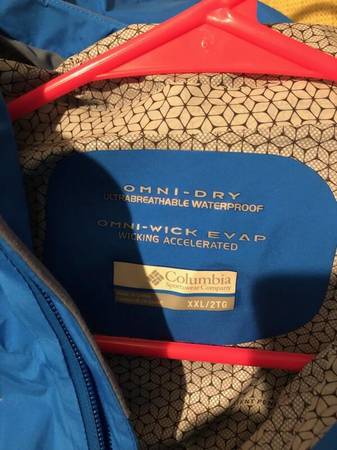 Brand new Columbia wind breaker never worn. Purple / blue / yellow. Selling very cheap, paid over $120.00 like tens years..were just cleaning out our closet selling things I don't need or wear