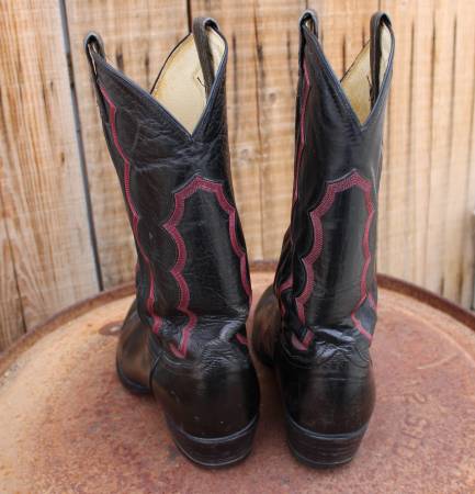 Boots by Tony Lama, El Paso, Texas, USA. Size 11.5D, Style 8985. Circa 1970s. Collectible. Black with lavender trim.