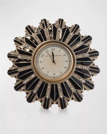 This stunning Jay Strongwater clock exudes the timeless elegance of Art Deco. Crafted from high-quality pewter with a lustrous black finish, it is adorned with gold accents and sparkling Swarovski crystals. Handmade in the United States, this original piece is a true testament to the skill of its creator.