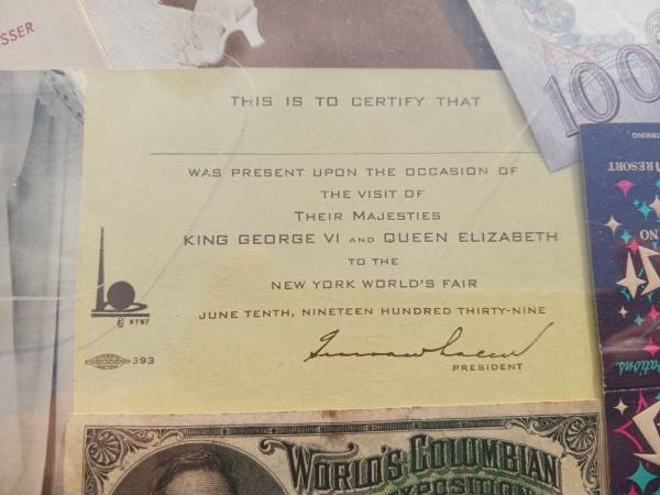 Interesting items are a ticket with Abraham Lincoln's picture on it for the 1893 World's Columbian Exposition in Chicago, and an unused ticket (2 stubs) for the 1939 World's Fair in New York. Both are in excellent condition.