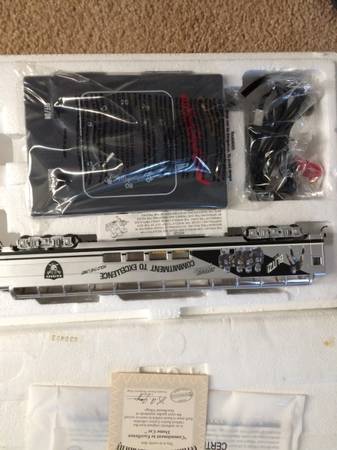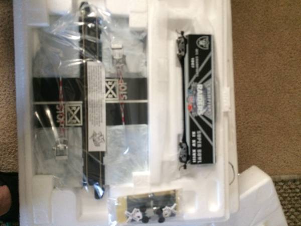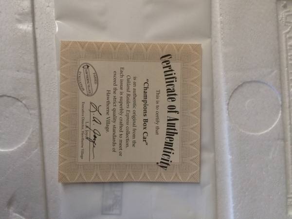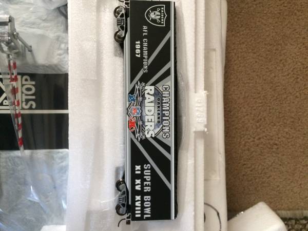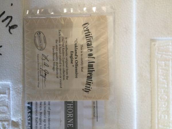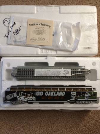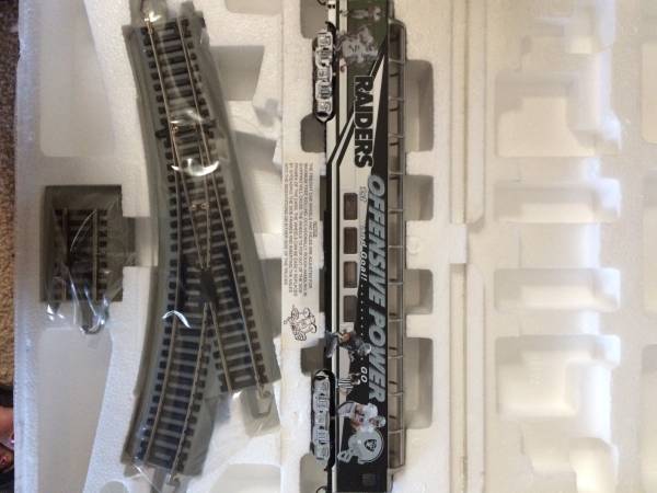 NEW OAKLAND RAIDERS TRAIN SET. COMPLETE WITH TRACKS, NEVER USED. HAS LOCOMOTIVE ENGINE, OFFENSIVE POWER DOME CAR, FAN DOME CAR, DEFENSIVE DOME CAR, COMMITMENT TO EXCELLENCE DOME CAR CHAMPIONS BOX CAR & OAKLAND OFFENSIVE ENGINE. EACH PIECE HAS ITS Authenticity paperwork. I was going to hang the track in the family room ceiling but never did it. HAWTHORNE VILLAGE COLLECTABLES FOR THE TRUE RAIDER FAN THAT HAS IT ALL, EXCEPT THIS !! BE THE ENVY OF YOUR FRIENDS!! call show contact info