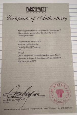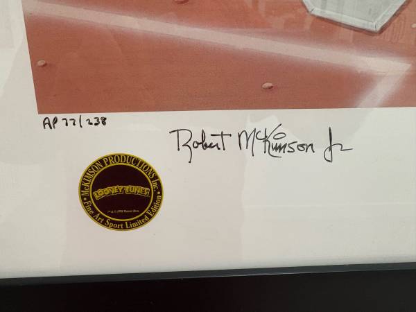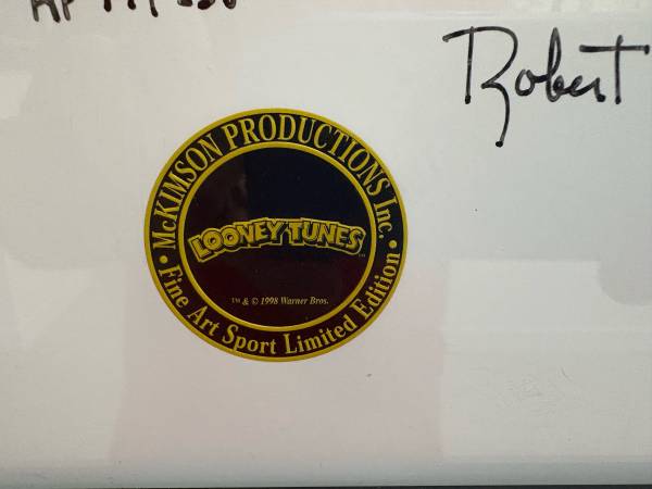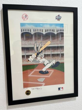 Offset lithograph (“Batter Up, Doc” Bugs Bunny in Yankees uniform) in color embossed on paper. Released for the 1998 World Series between the New York Yankees and the San Diego Padres. It’s an artist proof signed by Robert McKimson Jr. It’s numbered #77 of a very limited edition of 238. This limited edition is different from other limited editions available on eBay and other sites like Etsy. The appraised value in 2005 was $825. Certificate of Authenticity is included.