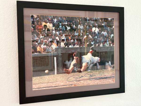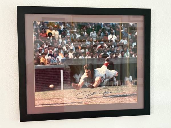 Framed Pete Rose Sliding Color Photograph signed by Pete Rose in 2004. Measures 16” x 20” unframed. As a bonus you’ll get the magazine by John Erardi.