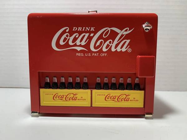 Vintage 2004 coca cola die cast musical vending machine cooler style table top battery operated plays coca cola jingle tune located in palm springs ca perfect like new located in palm springs ca