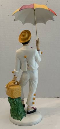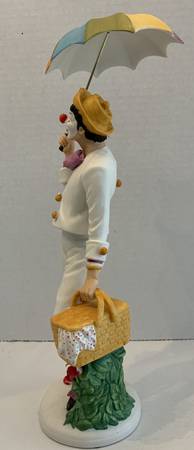 Hand painted Circus Clown holding a delicate porcelain umbrella and a picnic basket. Extremely detailed and wonderful piece. It is approx. 13 " tall and made in 1983.
