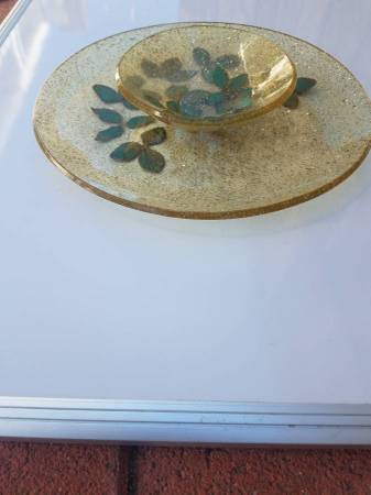 Mid Century Modern Lucite/Acrylic platter with attached bowl is great for chips and dip or veggies. The bowl is attached to the plate? You'll never lose it! The Acrylic is nice and thick and embedded with gold glitter flecks and green leaves with gold trim. 13" diameter.