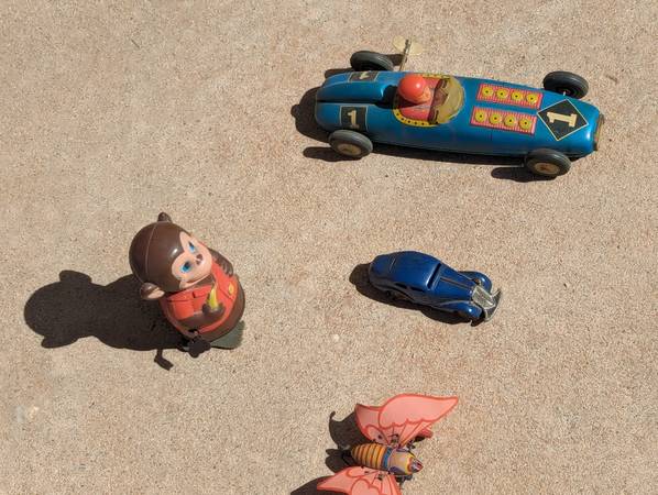 WILL REMOVE ANY ITEMS I SOLD... $136 for all 5 windup toys... WILLING TO NEGOTIATE... call or email for info ... Schuco 1001 German windup toy car... #1 tin race car windup toy... 1936 ford franklin mint precision model... antique wood hors tricycle...