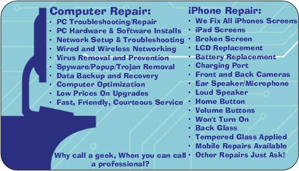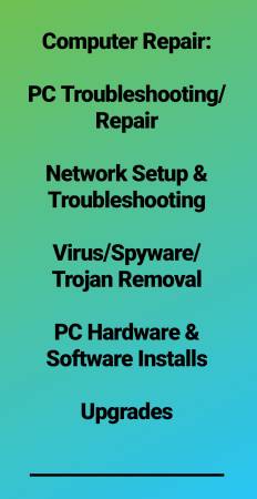 Computer Repair: PC Troubleshooting/Repair Network Setup & Troubleshooting Virus/Spyware/Trojan Removal PC Hardware & Software Installs Upgrades...