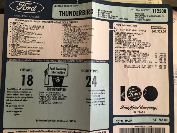 This vehicle was garage stored and has only 19,510 miles on the odometer. The owner retained the original window sticker and all service records for the vehicle, and will provide them to the new owner. Don't miss out on this rare opportunity to own this well maintained, low mileage 2003 Ford Thunderbird that shows like new.