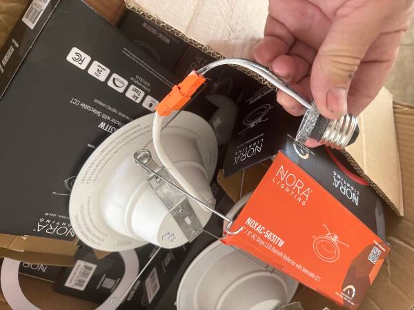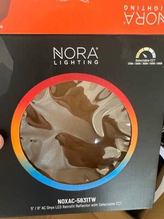 I’m selling 50 brand new Nora canned lights. These are not adjustable in the color. These are white white 6 inches crossed come with the pig tail and the socket and to thread into older can lights. If you don’t have the cans in the ceiling, you will have to purchase them and have them installed. These are not Home Depot or Lowe’s quality. These are directly from the manufacturer Nora Enterprises. I ordered through a local electrical store. I’m selling them all 50 together. I’m not breaking them up. I replaced them with the adjustable style also Nora but these look really good. I have 60 total but I’m keeping 10 for myself. .