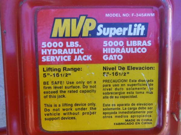 MVP Superlift 5000 lbs (2.5 ton) Hydraulic Service Jack. Lifting range 5" - 16.5" Very little use - good condition with only a few times with my Ford truck Call or text Robert anytime - - $45.00