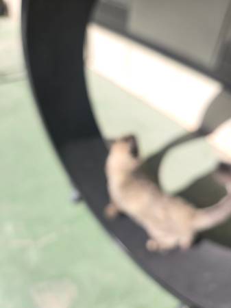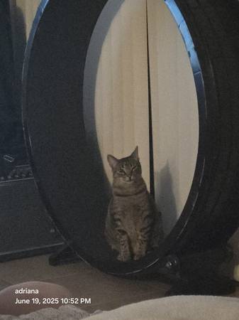 One Fast Cat large catwheel. 2 years old. Great for indoor cats! Helps with anxiety and overweight. My Cat now has a large yard and does not use this as .uch