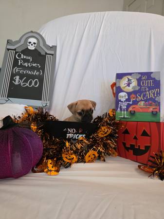 Adorable female chug puppies. 3/4 pug 1/4 chihuahua. Born 08/10/2025. Have first vaccinations. Very playful and friendly. Raised with other animals and children. Should be around 10 pounds when...
