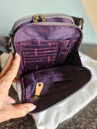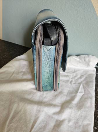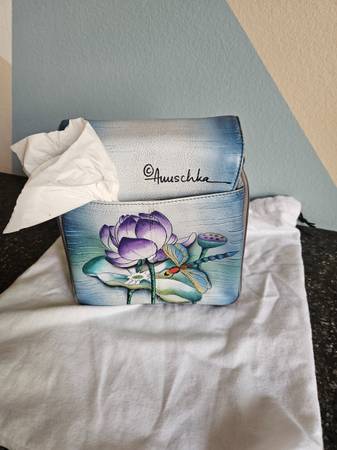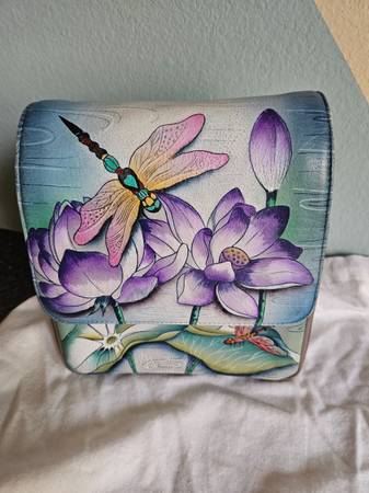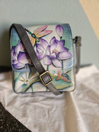 One of a kind leather bag - hand painted and signed by a member of the Anuschka family. Truly unique. Spacious with two zippered compartments, and inside pocket and a back pocket. Adjustable shoulder strap. Vibrant colors